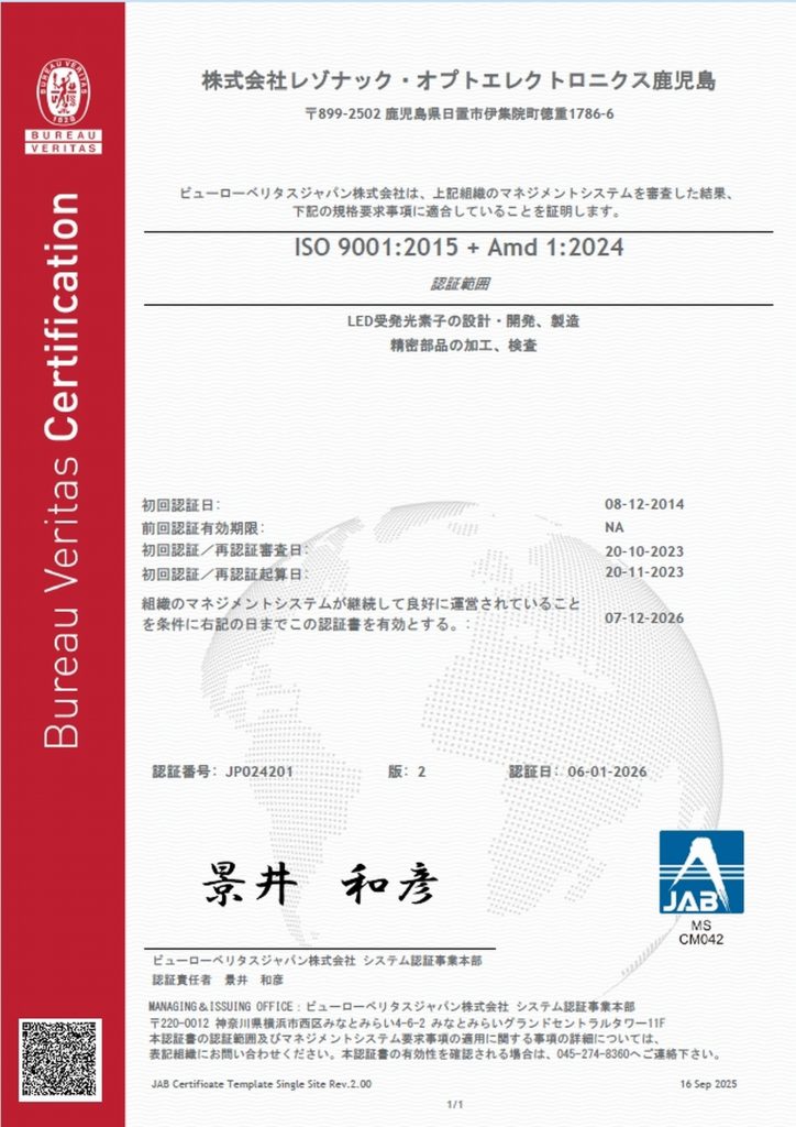 認証範囲:LED受発光素子の設計・開発、製造、精密部品の加工、検査